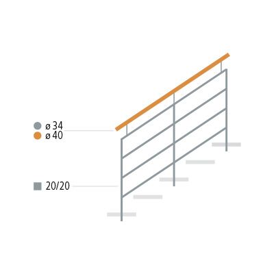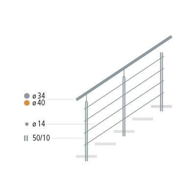 Steigegeländer mit sechs linear verlaufende Knieleisten (Anzahl variabel), Handlauf auf Dornen.
